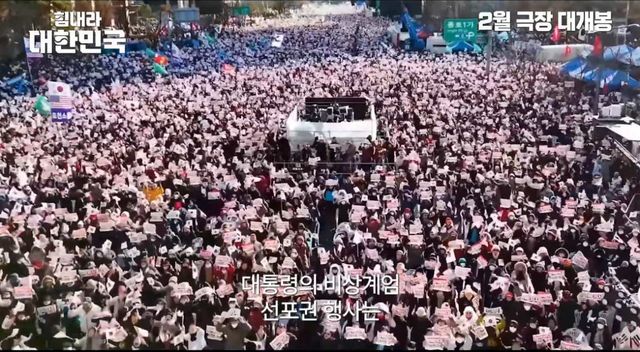 '힘내라 대한민국'은 윤석열 대통령이 지난해 12월 3일 발표한 비상계엄을 지지하는 내용을 담은 다큐멘터리 영화다. 공개된 예고편에는 윤 대통령이 계엄을 언급하는 장면과 전광훈 목사, 배우 최준용, 강사 전한길 등의 모습이 포함돼 있다. 제작사인 영화사 아리랑 측은 "민주당의 입법 독재로 나라가 흔들리는 상황에서 대한민국을 지키기 위한 대통령의 결정을 조명하는 역사 다큐멘터리"라고 설명했다.