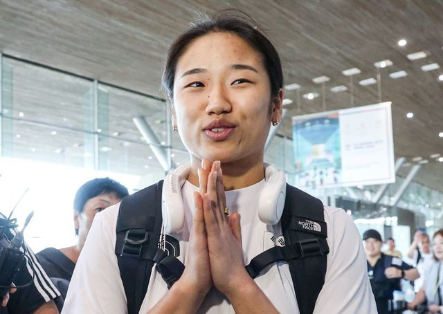 2024 파리올림픽 단식에서 금메달을 수확한 배드민턴 국가대표팀 안세영이 지난해 8월 7일(한국 시각) 프랑스 파리 샤를 드골 공항을 통해 귀국길에 오르며 취재진 질문에 답변하고 있다. / 뉴스1