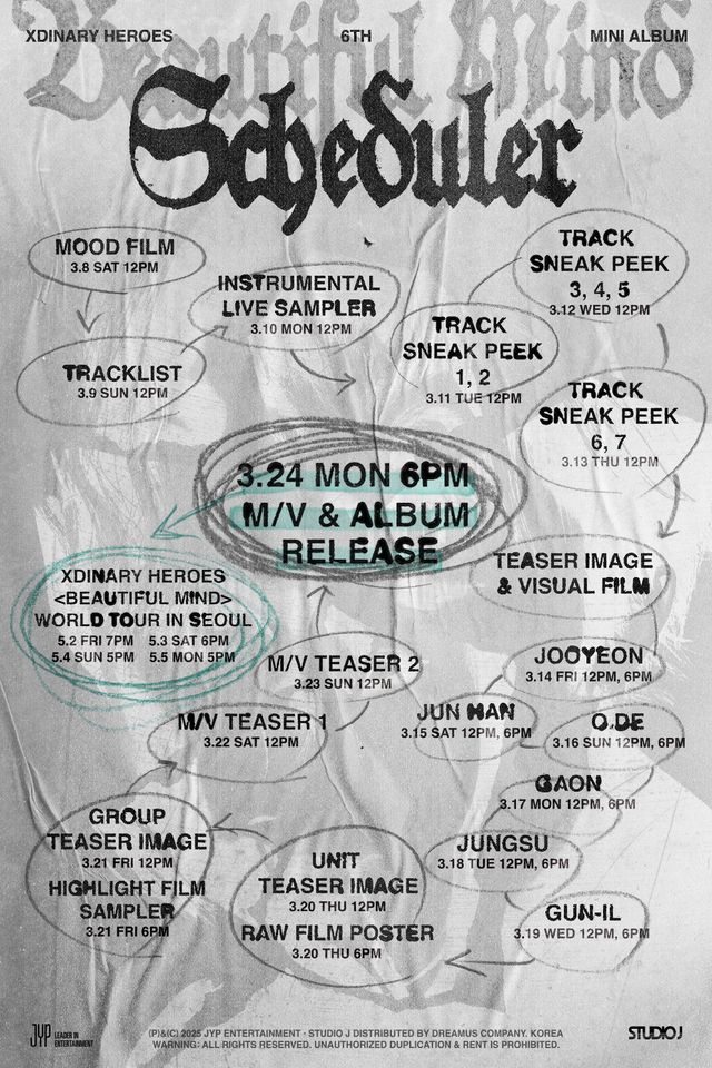 오는 24일 여섯 번째 미니 앨범 ‘Beautiful Mind’(뷰티풀 마인드)를 발매하고 컴백하는 엑스디너리 히어로즈. 소속사 JYP는 5일 오후 공식 SNS 채널에 컴백 소식을 알리는 포스터를 깜짝 오픈한데 이어 7일 정오 신보 프로모션 일정을 담은 스케줄러 이미지를 소개했다.