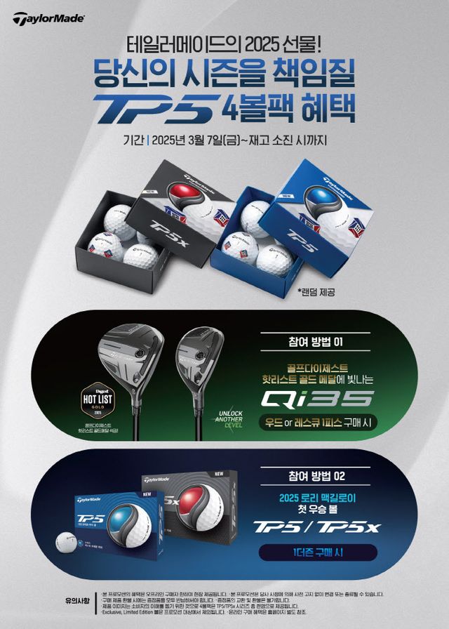 Qi35 페어웨이 우드 또는 레스큐 1피스 구매 고객과 TP5·TP5x 골프볼 1더즌 구매 고객에게 TP5/TP5x 4볼 팩을 랜덤으로 제공한다.