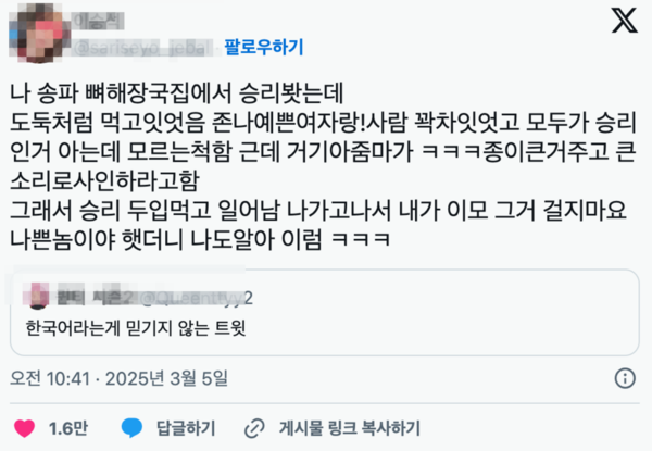 하지만 한 직원이 승리에게 큰 종이를 주며 "사인하라"고 요청하자, 그는 결국 두 입만 먹고 황급히 식당을 떠났다고 한다.