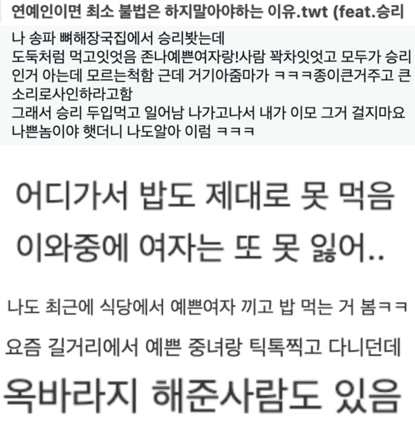 글 작성자는 "승리가 엄청 예쁜 여성과 함께 도둑처럼 조용히 식사를 하고 있었다"고 전했다. 이어 "식당이 꽉 차 있었는데 모두 승리인 걸 알면서도 모르는 척했다"고 덧붙였다.