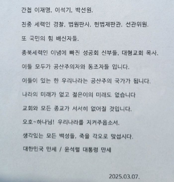 내용은 "윤석열 대통령 만세" "종북 세력의 음모가 엄청나다. 이들이 있는 한 우리나라는 공산주의 국가가 된다" "나라의 미래가 없고 젊은이의 미래도 없다. 교회와 모든 종교가 서서히 없어질 것" "생각 있는 모든 백성, 죽을 각오로 맞서자" 등이 담겨 있었다.