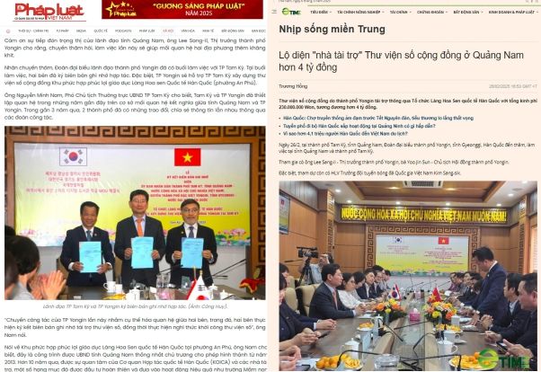 | ▲ 베트남 법률신문(좌)과 베트남이타임즈(우)에 게제된 이상일 시장 방문과 땀끼시 스마트도서관 건립 지원 기사 |