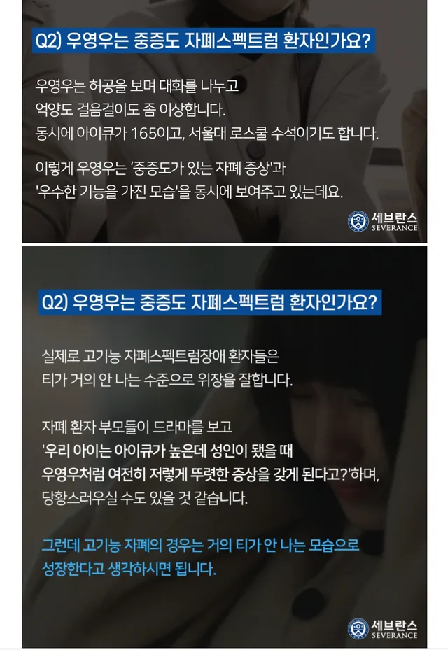 그래서 우영우가 유행했을때 고기능 자폐 아동이 성인이 되어서도 저렇게 이상행동을 하게되는지 걱정하는 부모들이 있었다고