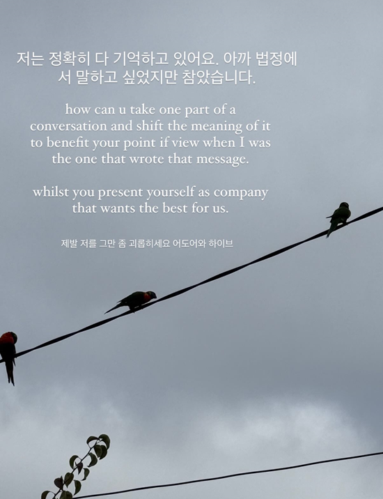 이어 "제발 저를 그만 좀 괴롭히세요 어도어와 하이브"라고 하이브 및 어도어를 정조준해 강하게 비난했다.