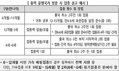 면역체계가 취약한 1세 미만 영유아는 홍역 유행국가 방문을 최대한 자제하고, 불가피한 경우 생후 6개월 이상 12개월 미만 영아는 출국 전 가속 예방접종을 받아야 한다.