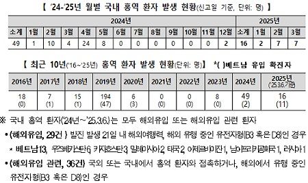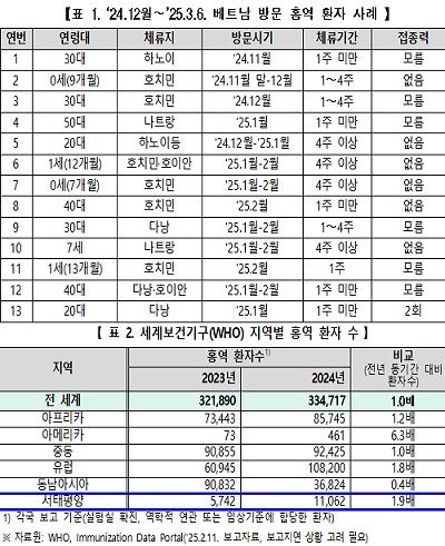 특히 2024년 12월부터 2025년 3월까지 확진된 18명 중 13명이 베트남 방문 이력이 있으며, 이 중 12명은 백신 접종력이 없거나 불명확했다.