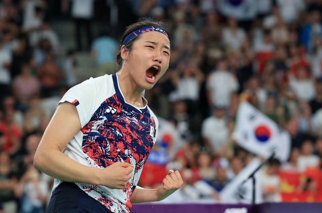 대한민국 배드민턴 대표팀 안세영이 지난해 8월 5일 오후(한국 시각) 프랑스 파리 라 샤펠 아레나에서 열린 2024 파리올림픽 배드민턴 여자 단식 결승 중국의 허빙자오 선수와의 경기에서 금메달을 확정 지은 후 기뻐하고 있다. / 뉴스1