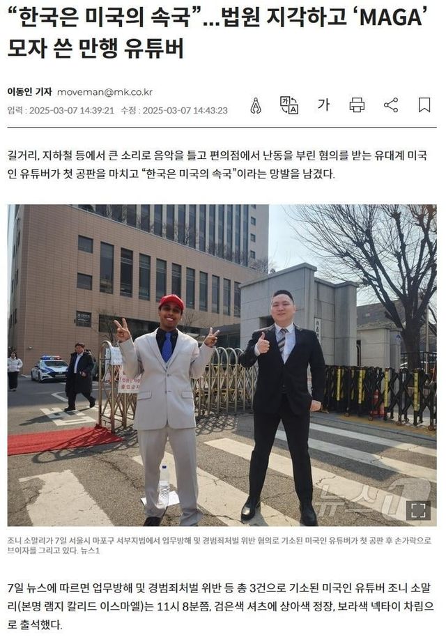 - 재판 끝나고 난 후 왜 MAGA 모자를 쓰고 왔냐고 기자가 물으니 " 자신은 미국인이고, 한국은 미국의 속국이기 때문이다"라고 말함