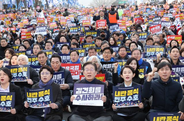 이어 야 5당은 “국민은 12월 3일 밤 장갑차와 총칼도 맨 손으로 막아내고 12월 14일 탄핵열차를 국회로 헌재로 향하게 만들었다”면서 “이 자리에 있는 야 5당 대표자들은 위대한 우리 국민과 함께 손잡고 빛의 혁명을 완수하겠다”고 다짐했다. 끝으로 야 5당은 “국민과 함께, 우리의 손으로, 빼앗긴 주권을 되찾아낼 것을 엄중히 선언한다”고 덧붙였다.