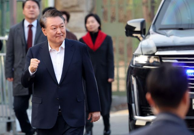 윤 대통령은 약 100m가량을 걸어나오면서 주먹을 쥐어 보이거나 손을 흔들었다. 밝은 표정으로 “감사합니다”라고 인사를 건네기도 했다.