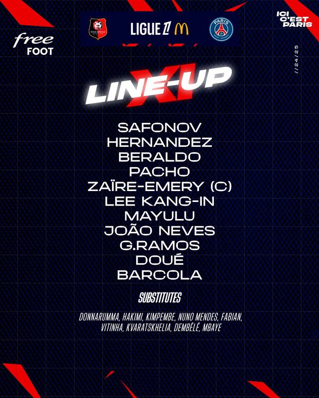 PSG는 4-3-3 전형으로 나선다. 골문은 마트베이 사포노프가 지킨다. 뤼카 에르난데스, 윌리안 파초, 루카스 베랄두, 주앙 네베스가 수비를 맡고, 세니 마율루, 워렌 자이르 에메리, 이강인이 중원에서 호흡을 맞춘다. 브래들리 바르콜라, 곤살루 하무스, 데지레 두에가 최전방 스리톱을 이룬다.