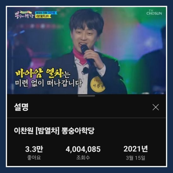 (엑스포츠뉴스 이정범 기자) 이찬원의 '밤열차' 무대가 400만 조회 수를 돌파했다.