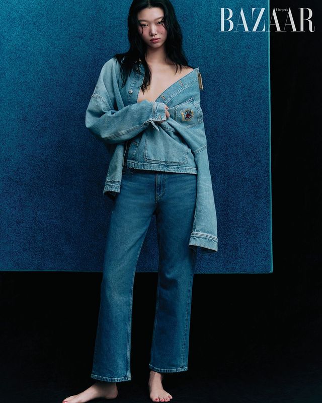 데님 재킷, 데님 팬츠는 Tommy Jeans.