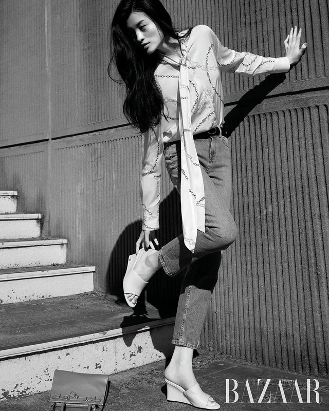 보 디테일 블라우스, 데님 팬츠, 벨트, 웨지 힐 슈즈는 모두 Tommy Hilfiger.