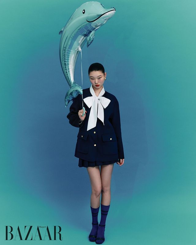 재킷, 보 디테일 블라우스, 플리츠 스커트, 양말, 슈즈는 모두 Tommy Hilfiger. 이어커프는 Tee Ring Jay. 귀고리, 반지는 & Other Stories.