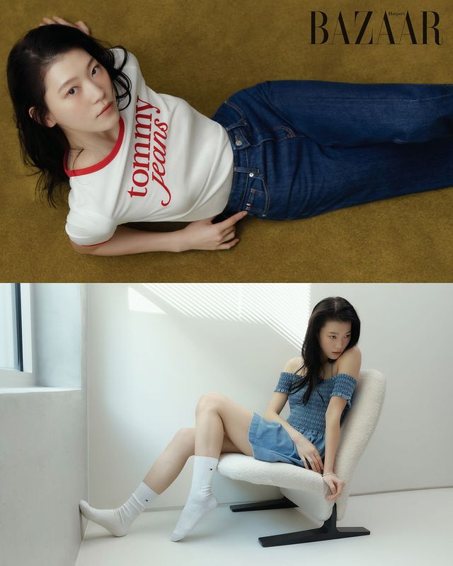 (아래) 데님 드레스는 Tommy Jeans. 양말은 Tommy Hilfiger. 팔찌, 반지는 Tee Ring Jay.