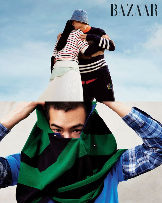 (위) 유엔씬이 착용한 윈드브레이커, 스트라이프 스웨터, 레이어드한 스웨터, 이너 셔츠, 스커트, 스니커즈는 모두 Tommy Hilfiger. 데님 팬츠는 Tommy Jeans. 천샤오가 착용한 코튼 바시티 재킷, 윈드브레이커, 스웨터, 트레이닝 팬츠, 양말, 스니커즈는 모두 Tommy Hilfiger. 버킷햇은 Tommy Jeans. 귀고리는 Tee Ring Jay.