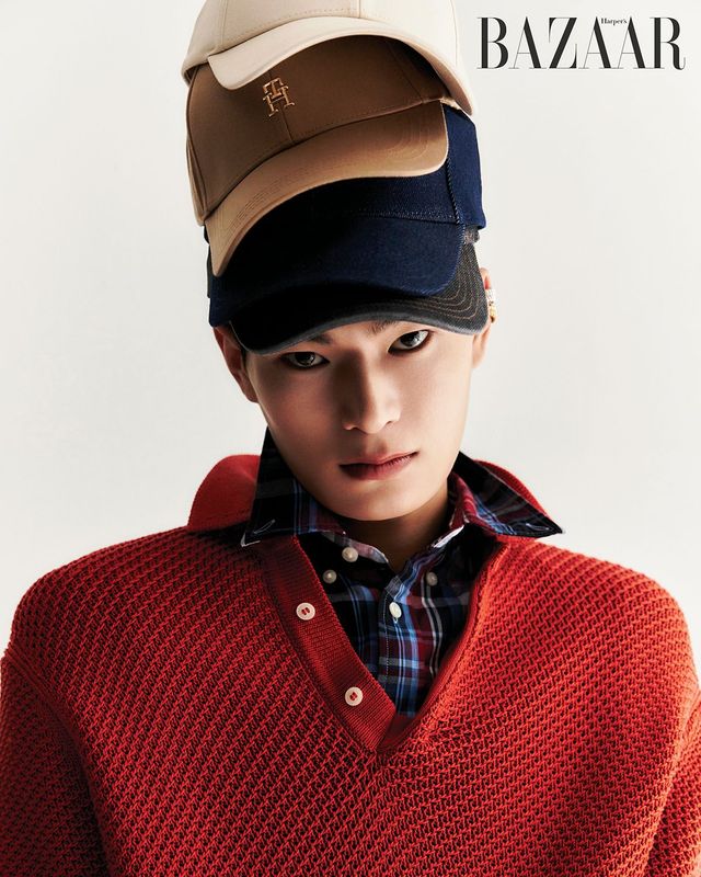 스웨터, 셔츠, 쌓아서 연출한 볼캡 3개는 모두 Tommy Hilfiger. 데님 볼캡은 Tommy Jeans. 레이어드한 이어커프는 Tee Ring Jay.