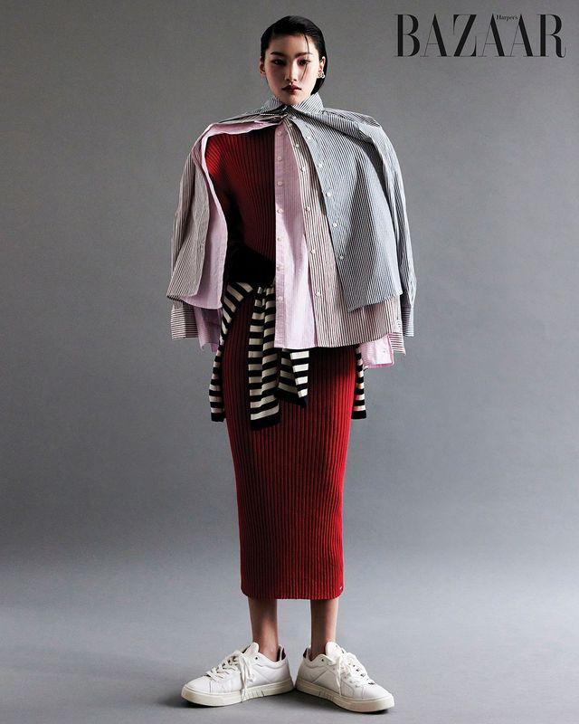케이프처럼 연출한 셔츠 세 개, 드레스, 허리에 두른 스웨터, 스니커즈는 모두 Tommy Hilfiger. 레이어드해 착용한 이어커프는 Tee Ring Jay.