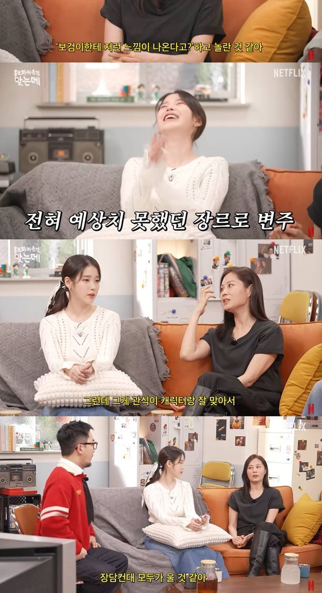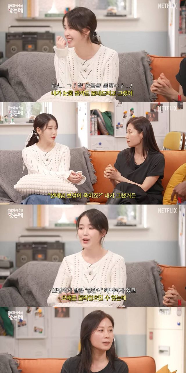 이에 아이유는 "나도 울었다. 나도 울면서 보고. 대본을 보면서 우는 일은 잘 없다. 드라마나 영화를 봐도 잘 우는 타입은 아니다. 마음 아픈 건 느끼지만 실제로 눈물이 나지는 않는다. 근데 정말 깔깔 웃으면서, 울면서 보고. 작가님이랑 가까워지고 나서는 눈물 셀카도 보내고 그랬다"고 전했다.