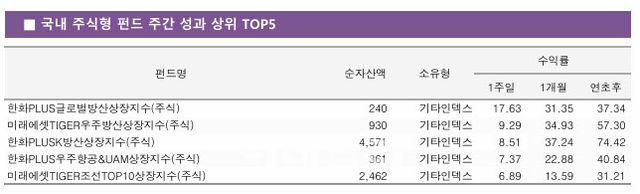 수익률 3위와 4위는 ‘한화PLUS K방산 ETF’(8.51%)와 ‘한화PLUS 우주항공&UAM ETF’(7.37%)가 각각 차지했다. 두 ETF 역시 한화에어로스페이스 등 국내 주요 방산 및 우주항공 관련 업체들에 투자한다.