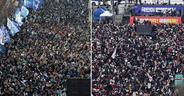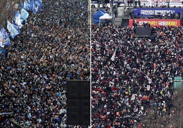 법원의 윤석열 대통령 구속 취소 결정 이후 첫 주말인 지난 8일 서울 도심 곳곳에서 윤 대통령 탄핵 찬반 집회가 열렸다. 사진 왼쪽은 종로구 안국동에서 열린 찬성집회 '야5당 공동 윤석열 파면 촉구 2차 범국민대회'. 오른쪽은 광화문 광장에서 열린 탄핵 반대집회'자유통일을 위한 국민대회' / 뉴스1