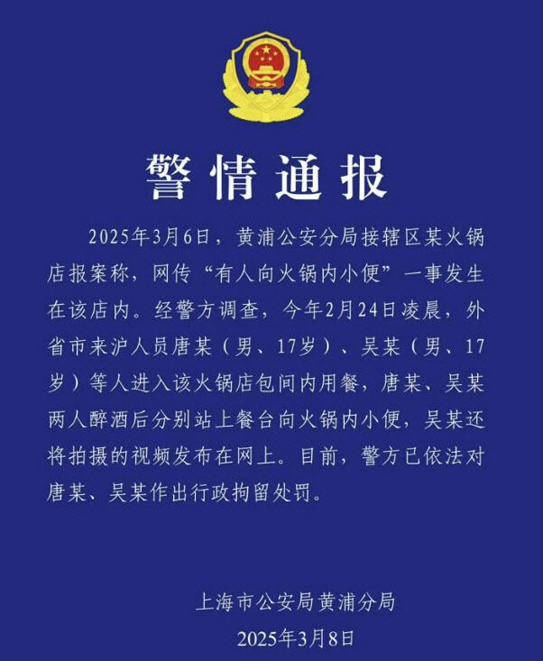 9일 중국 관영 글로벌타임스(GT)에 따르면 상하이 경찰은 훠궈 체인점인 하이디라오에서 훠궈에 소변을 보고 그 영상을 온라인에 올린 혐의로 두 사람을 행정 구금했다고 전날 발표했다.