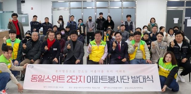 봉사단 발대를 축하하기 위해 방문한 최충규 대덕구청장은 “자원봉사로 하나 되고, 이웃 간 정이 넘치는 동일스위트2단지아파트가 되길 응원하겠다”라고 말했다.