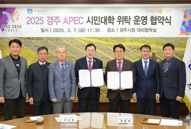시는 지난 7일 시청 대외협력실에서 동국대학교 WISE캠퍼스와 2025 경주 APEC 시민대학 위탁 운영을 위한 업무협약을 체결하고 운영 방향에 대해 논의했다.