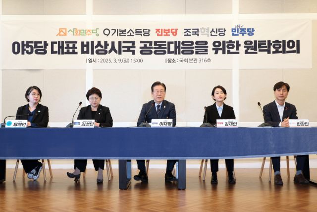 이재명 민주당 대표는 9일 조국혁신당·진보당·기본소득당·사회민주당 등 원내 야당 대표와 원탁회의를 갖고 "상황이 매우 엄중하다"며 "내란의 밤이 아직도 끝나지 않고 계속되고 있다. 내란수괴가 희한한 법 해석을 통해서 구속을 면했다는 사실이 믿기지가 않는다"고 상황의 심각성을 강조했다.