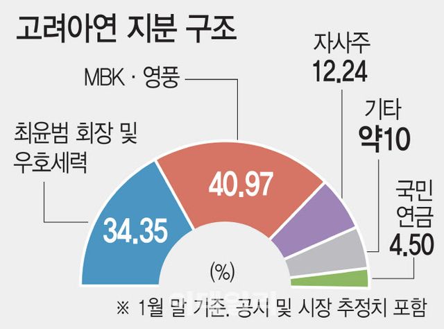 9일 업계에 따르면 고려아연은 이달 말 정기 주총에서 MBK연합과 이사회 구성을 두고 의결권 대결을 벌일 전망이다. 앞서 법원은 지난 7일 MBK·영풍이 제기한 신청한 주총결의 효력정지 가처분을 일부 인용했다. 법원이 집중투표제 도입을 인정하며 최 회장 측은 당장은 한숨 돌리게 됐다. 집중투표제는 주총에서 선임되는 이사 수만큼 주주에게 의결권을 부여하는 방식으로 소수 주주가 많은 최 회장 측에게 더 유리한 제도다. 예를 들어 새로 선임되는 이사 수가 5명이라면 주식 1주를 가진 주주는 5표를 행사할 수 있다. 주주는 이 표들을 특정 이사에게 몰아서 행사할 수 있기 때문에 소수주주가 추천한 이사가 이사회에 진입할 확률이 높다. 최 회장 측의 특별관계자 수는 50명이 넘는다.