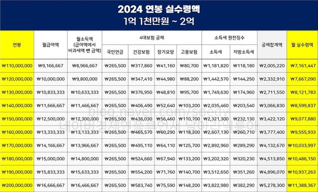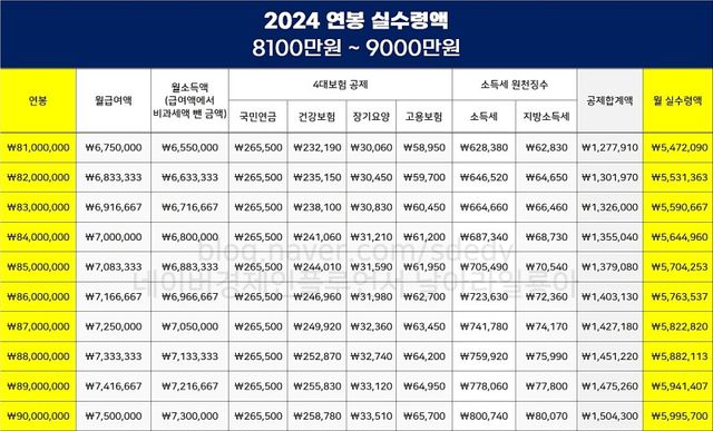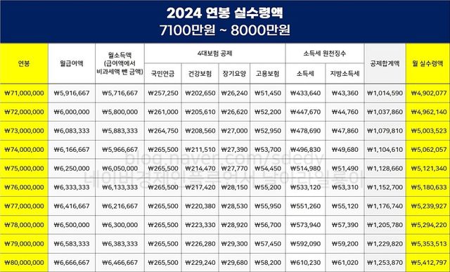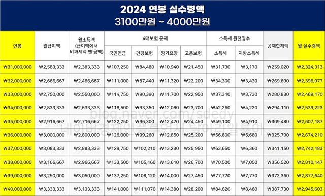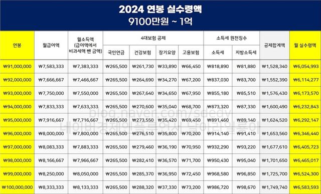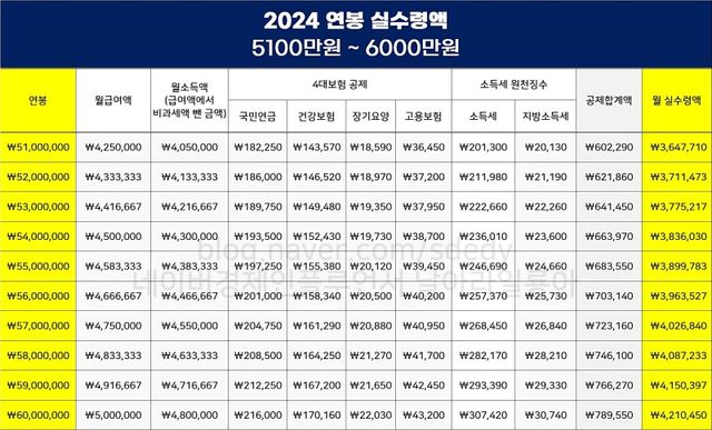 2024년 연봉 별 실수령액