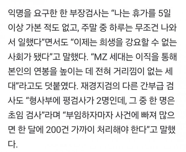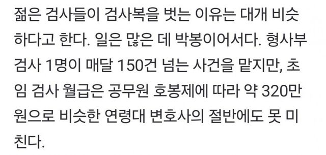 검사 수는 적고, 일은 늘어나는 마당에 돈은 적게 벌어서 몇 년 사이에 수사 실무를 담당할 평검사들이 검찰 탈출하고 있음