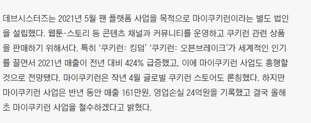 마이쿠키런 사업 반년 동안 매출 161만원(이익 아님 매출임) 및 영업손실 24억원을 기록한게 밝혀지면서 40여명이서 일 안하고 붕어빵을 팔아도 매출이 200만원을 넘겠다면서 영업손실 수십억에 달하는동안 아직도 안자른 데브시스터즈가 더 대단하다는 반응이 나와버림