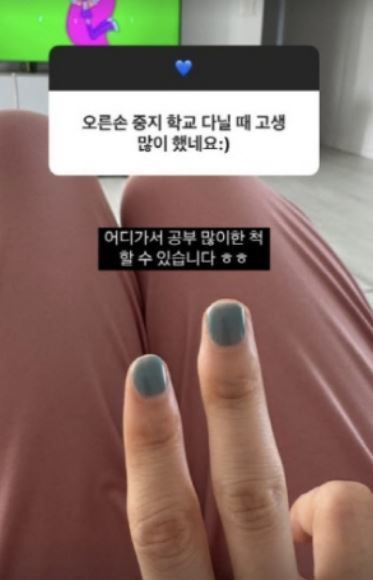 이에 한 네티즌은 "오른손 중지 학교 다닐 때 고생 많이 했네요"라고 말했고, 김소영은 "어디 가서 공부 많이 한 척 할 수 있습니다"라고 답했다.