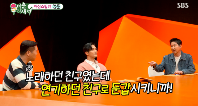 성훈은 예상치 못한 공격(?)에 “네?”라고 반문하며 “이건 짚고 넘어가야겠다”고 말했고, 신동엽은 “성훈 입장에서 지금 찝찝할 수 있다. 노래하던 친구였는데 연기하던 친구로 둔갑시키니까”라고 받아쳤다.