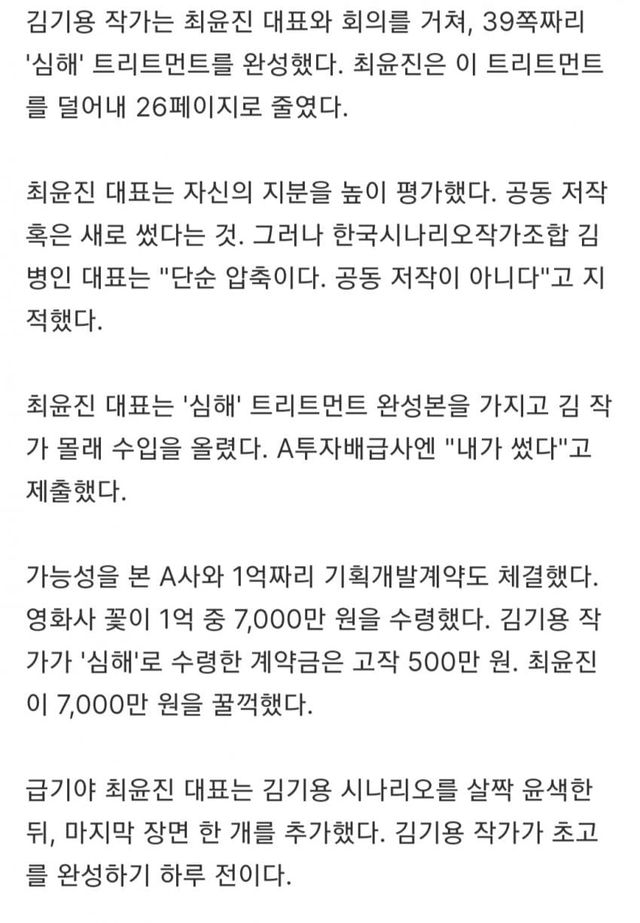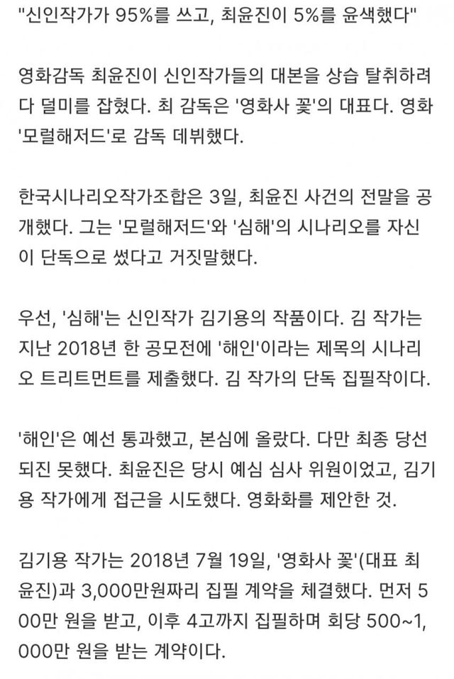 요약 : 한국시나리오작가조합에 따르면 최윤진 감독이 신인 작가의 시나리오를 단순 압축 및 편집 정도만 해놓고 본인 단독으로 쓴 작품이라고 속여서 각종 지원금 및 계약금 수천만원씩 도합 1억원 이상을 횡령함