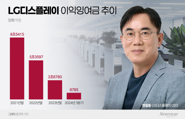 LG디스플레이의 작년 3분기 보고서를 보면 유동성의 지표 중 하나인 이익잉여금(연결기준)은 9785억원으로 전년말의 2조6760억원 대비 36% 수준까지 쪼그라들었다. 이 회사의 이익잉여금은 2021년까지만 해도 8조5415억원에 달했으나 ▲2022년 5조3597억원 ▲2023년말 2조6760억원 등 해마다 절반씩 줄었다.