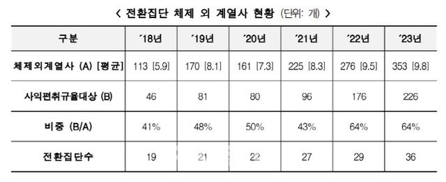 공정거래위원회에 따르면, 국내 총수일가가 지주사 외 지배하고 있는 계열사가 2023년 기준 353개로 나타났다. 이중 사익편취 규제대상 회사는 226개에 달한다. 총수 일가가 지주회사 체제 밖에서 사익편취 규제대상 회사에 영향력을 행사할 수 있는 구조다. 국내 총수있는 지주사의 내부거래 비중은 13.36%다. 이는 일반기업의 내부거래 비중 10.96%보다 높다.