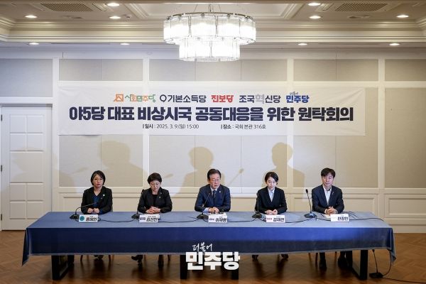 더불어민주당·조국혁신당·기본소득당·진보당·사회민주당은 9일 오후 국회에서 '비상시국 공동 대응을 위한 원탁회의'를 열고 윤 대통령 파면 전까지 시민사회와 연대해 비상공동행동에 돌입하기로 했다. 헌법재판소 탄핵 심판 결과가 나오기 전까지 시민사회와 매일 윤 대통령 파면 촉구 집회에 참석할 방침이다.