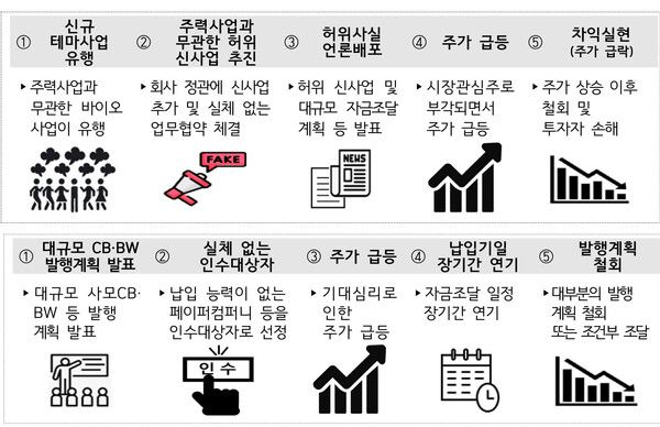 금융당국은 ▲투자자들에게 주력사업과 무관한 업종으로의 신사업 진출을 발표하는 경우 실제 추진 역량이 있는지 면밀히 확인해야 하며, ▲유행하는 테마사업 발표와 함께 이뤄지는 자금조달 공시인 경우 신중한 투자와 주의를 당부했다.