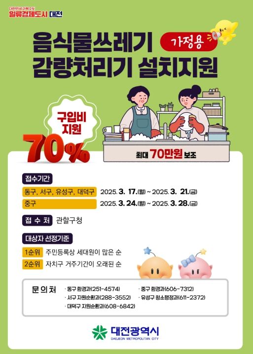 신청 방법은 동구청 환경과에 방문 신청하면 되며, 감량처리기는 1대당 70만 원 한도 내에서 구매비용의 70%까지 지원한다.