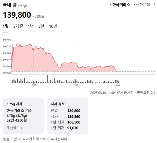 국내 금시세(금값)가 10일(한국 시각) 오후 상승세(전 거래일 대비)를 보이고 있다.