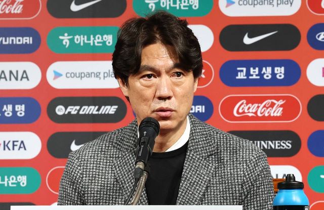 홍명보 대한민국 축구 국가대표팀 감독이 10일 오전 서울 종로구 신문로 축구회관에서 2026 국제축구연맹(FIFA) 북중미 월드컵 아시아 3차 예선 B조 7차전 오만전과 8차전 요르단전 소집 명단을 발표하고 있다 / 뉴스1