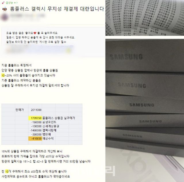 문제는 이런 불안 심리를 이용한 되팔이가 성행하고 있다는 점이다. 실제로 네이버의 한 재테크 카페에서는 홈플러스 상품권을 대량 매입해 갤럭시 전자 제품 10대를 구매, 재판매를 통해 400만원 수익이 예상된다는 글이 등장했다. 게시자는 “안양·명동 상품권 업체나 당근에 홈플 상품권 물량이 쏟아지고 있다”며 “잘 구매해서 무지성 재결제를 달려야 한다”고 했다.