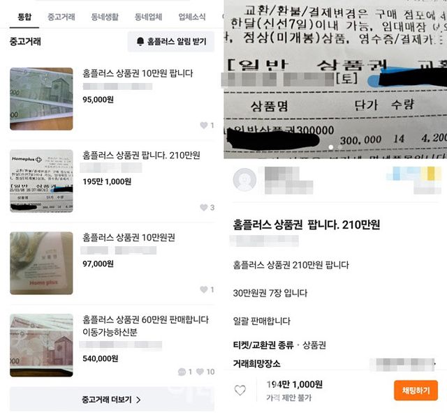 10일 중고 거래 플랫폼 당근에는 홈플러스 상품권이 봇물처럼 쏟아지고 있다. 통상 상품권에는 5%가량의 할인율이 적용되지만 10%가량 할인하는 판매글도 어렵지 않게 찾을 수 있다. 한 게시자는 60만원권 홈플러스 상품권을 54만원에 거래한다고 올렸다. 총 210만원인 30만원권 홈플러스 상품권 7장을 195만 1000원에 팔겠다는 글도 있다.