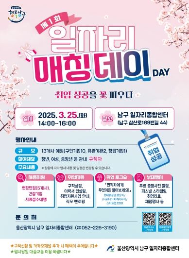 [파이낸셜경제=김예빈 기자] 울산 남구는 오는 25일 남구 일자리종합센터에서 구인 기업의 채용시기에 맞춘 현장면접과 참여자가 능동적으로 참여할 수 있는 취업 토크쇼와 각종 부대행사 등 다양한 취업지원 콘텐츠로 구성된 남구 대표 채용행사인 ‘제1회 일자리매칭데이’개최를 본격적으로 준비한다고 밝혔다.