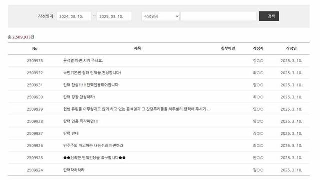 게시판에는 윤 대통령의 탄핵을 찬성하는 의견과 반대하는 의견이 동시에 올라오고 있다. 탄핵을 주장하는 이들은 "탄핵을 즉각 인용하라"는 내용의 글을 올리고 있으며, 반대하는 측은 "사기 탄핵을 당장 각하하라"며 맞서고 있다.